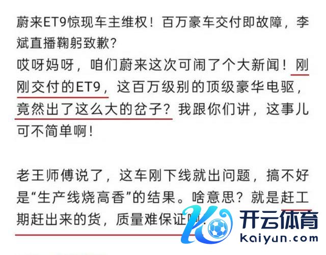 文中讲明,刚刚委用的蔚来ET9竟然出了这样大的岔子,赶工期赶出来的货,质地难以保证。