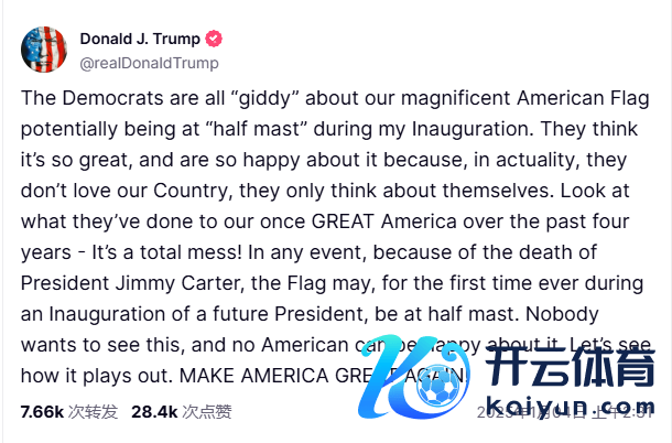 特朗普3日在外交媒体上发文,对1月20日总统接事仪式本日好意思国国旗仍继续因前总统吉米·卡特殒命而处于降半旗气象示意起火。
