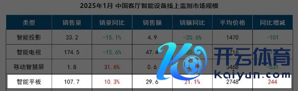 【CNMO科技音书】据CNMO了解,洛图科技(RUNTO)近日发布最新线上监测数据,2025年1月,中国客厅智能建立总零卖量为619.2万台,同比下降1.7%,总零卖额也同比下降6.9%。不外,智能平板品类的销量和销售额均已毕了增长。
