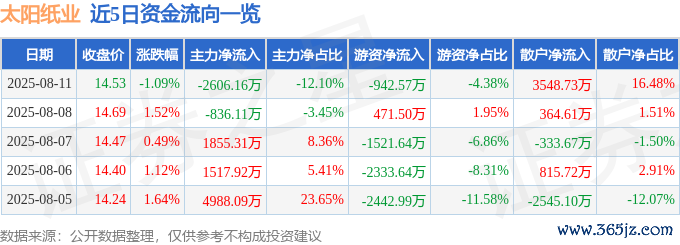 本站音讯,截止2025年8月11日收盘,太阳纸业(002078)报收于14.53元,着落1.09%欧洲杯体育,换手率0.54%,成交量14.8万手,成交额2.15亿元。