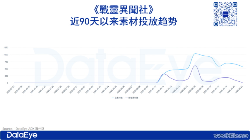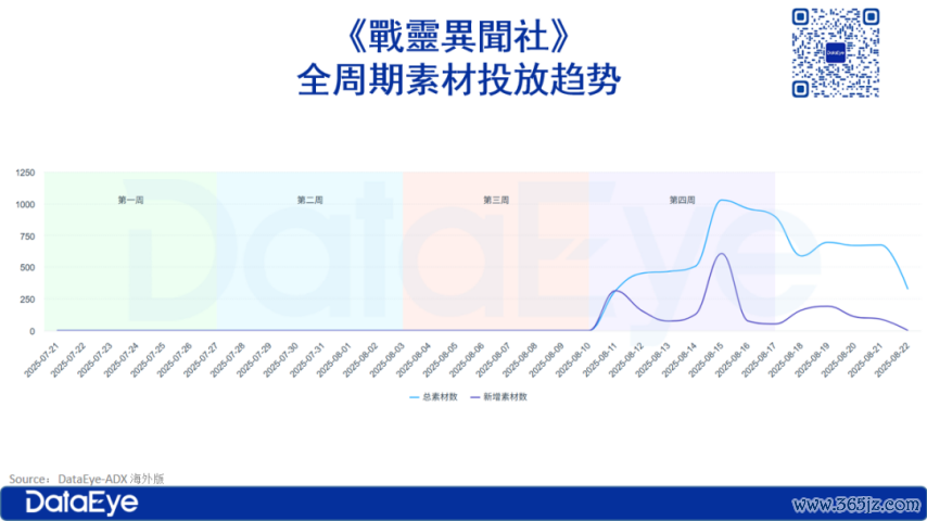 趋势分析:投放素材数与投放新素材数均为0,标明在这三周内莫得进行任何告白投放举止,也莫得进行预热。直到上线前一天,8月11日,投放素材数权臣增多至1292个,其中新增素材数为881个,占投放素材总和的68.19%。这标明在第4周,告白投放举止启动并大批引入新的告白素材。