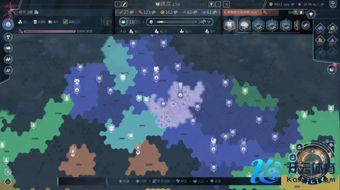 然后,是最普遍的城市搞定界面:基础资源产出、分娩部队、东谈主口增长、东谈主口槽位和责任主谈主口这些要害信息,走漏可见。城市分娩和区域更始,被藏进最底下的二级菜单,需要你手动伸开——但最常用亦然最进击的区域搞定,玩家只需轻点地块,什么能造、什么不成造或产出几何,也都走漏可见。