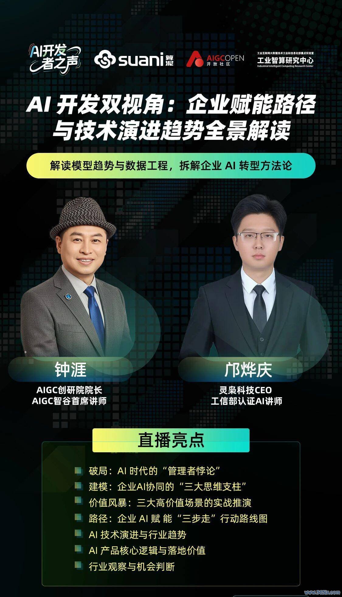这场时间盛宴由AIGC绽开社区与工业智算考虑中心采集打造,卓绝邀请两位深耕产业一线的实战派大家:AIGC创研院院长钟涯与灵枭科技CEO邝烨庆。两位嘉宾将分辩从企业落地与时间演进双维度张开剖析,为开采者呈现“从时间到生意”的全链条念念维框架。