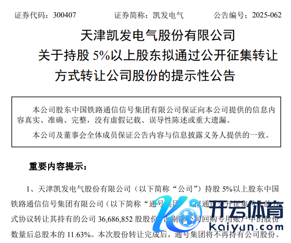 凯发电气11月25日晚间公告称,捏股5%以上鼓舞中国铁路通讯信号集团有限公司(简称“通号集团”)拟通过公开搜集转让的方式契约转让其捏有的公司3668.69万股股份,占剔除公司回购专用账户中的股份数目后总股本的11.63%。