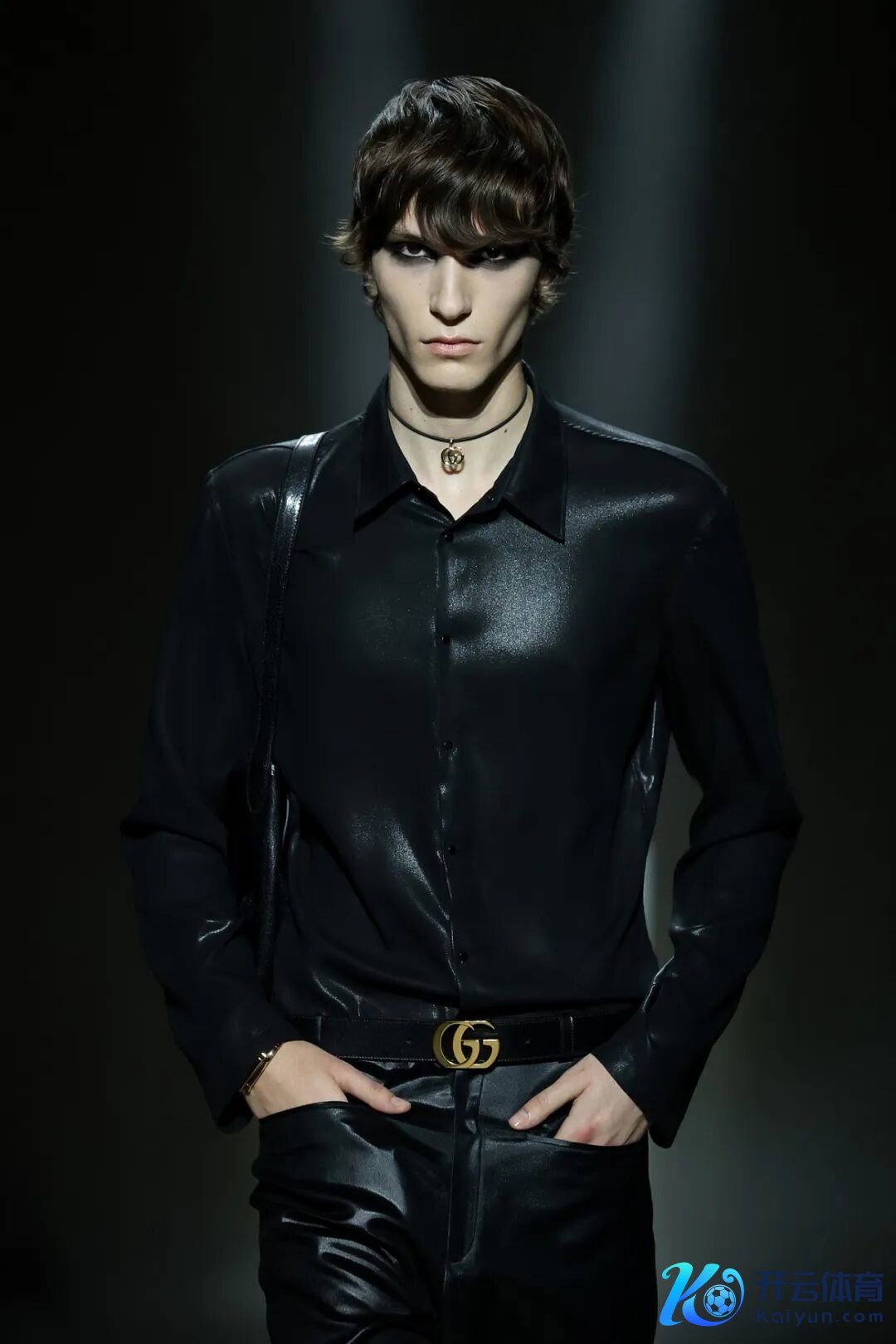 全新单品类型在本季系列中抓续演进。打底裤与长裤合二为一,夹克与上衣整合为一方法的贴身单品;柔嫩且豪阔延展性的迥殊皮革,为机车夹克、修身长裤与柔嫩环形披肩赋予微小质感与流动性;丽都的两件式套装以贴身上衣与垂坠长裤组成“派对男孩”式宣言,这些多元的时装面庞,束缚丰富“何为Gucci特色”这一问题的谜底。