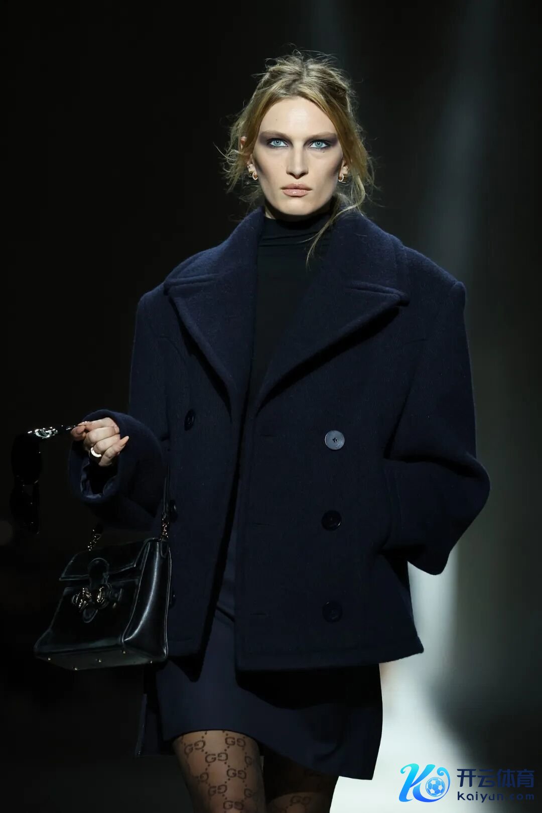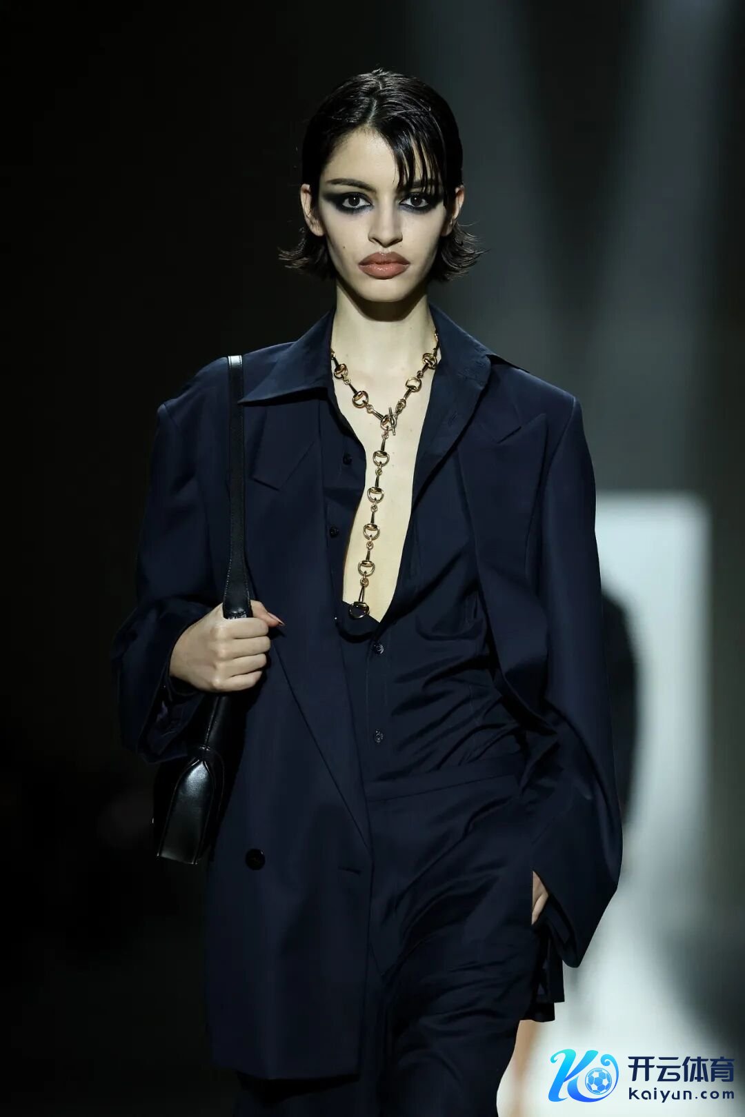 Demna用他拿手的时装讲话描述了“穿Gucci的女性”,她伊始不是一个被服装修饰的客体,她的身体被精准的剪裁勾画,被历害的概括放大,强调弧线与比例的张力通过宽肩、窄腰、修长裤型制造纵向延迟感,她的形象永久与“存在感”紧密连结。