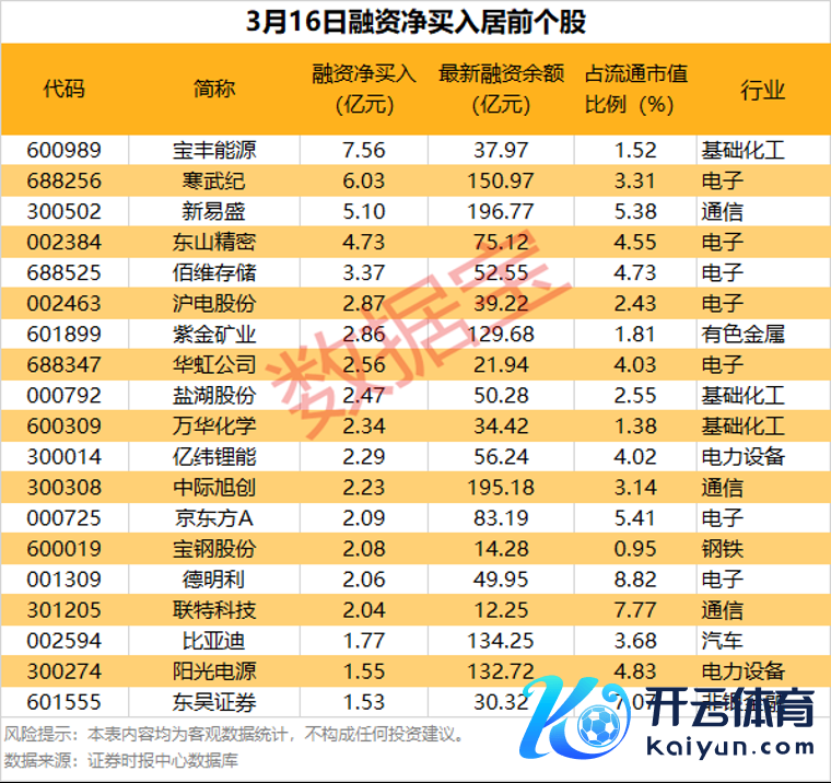 宝丰能源融资净买入额居首,当日净买入7.56亿元;其次是寒武纪、新易盛,融资净买入金额辩认为6.03亿元、5.1亿元。融资净买入金额居前的还有东山精密、佰维存储、沪电股份等。