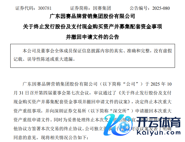 因赛集团10月31日晚间公告,公司于当日召开第四届董事会第七次会议,审议通过了《对于隔断刊行股份及支付现款购买金钱并召募配套资金事项并撤退苦求文献的议案》,决定隔断这次要害金钱重组事项,并向深交所苦求撤退要害金钱重组苦求文献。